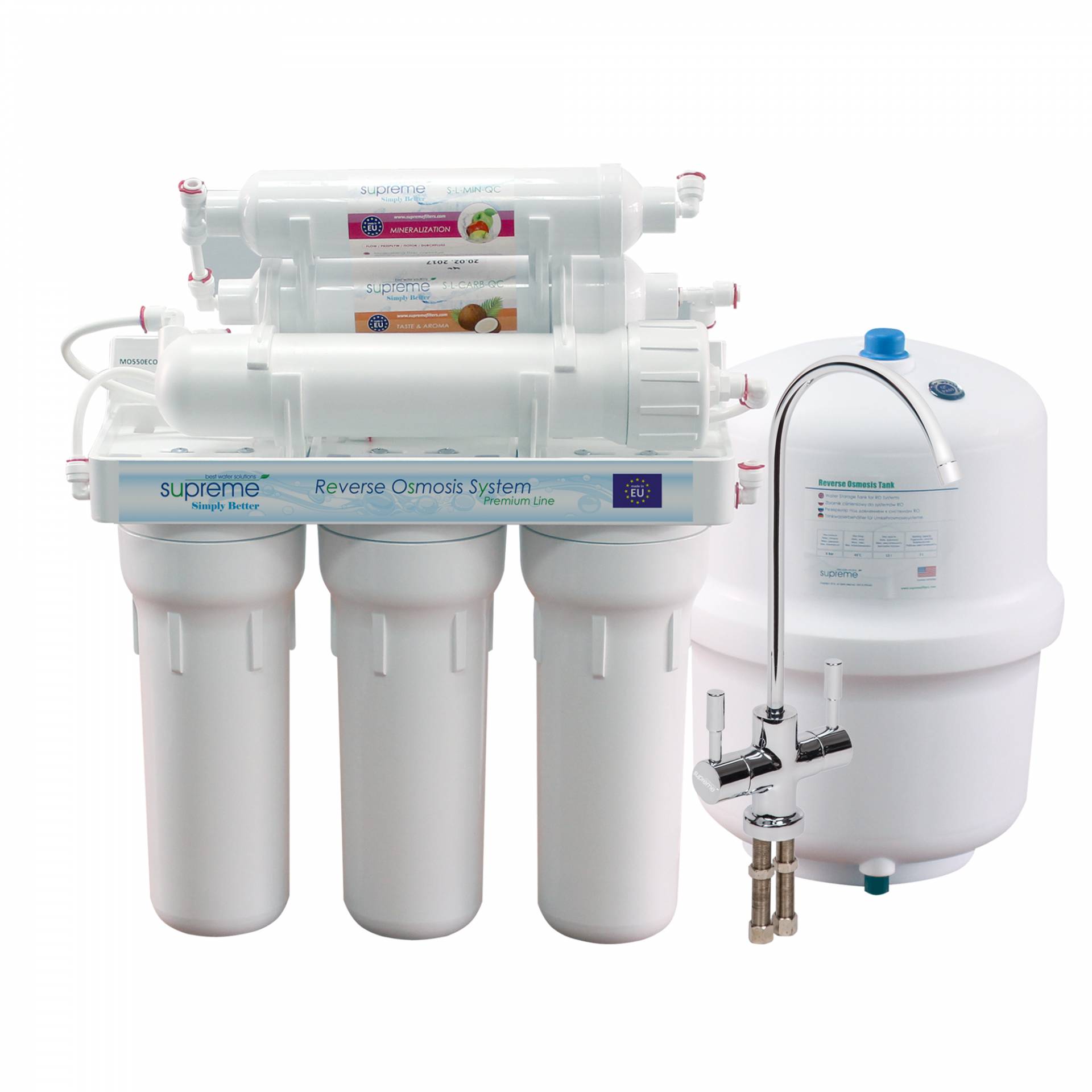 Nowoczesny i niezawodny filtr kuchenny, tak w skrócie można opisać system SUPREME-RO6. Doskonała jakość wykonania powoduje, że system SUPREME-RO6 nie ma sobie równych na rynku. Prezentowany filtr odwróconej osmozy pod zlewozmywak produkuje zdrową, mineralną wodę, zawierającą pierwiastki wapnia i magnezu w stężeniach podobnych do wartości, jakie występują w butelkowanych wodach mineralnych. Usuwa z wody większość zanieczyszczeń (96%-98%). Filtry do wody odwrócona osmoza RO6 w sprzedaży oferowany jest z kranem dwuobwodowym, który umożliwia pobór wody bezpośrednio po wkładzie mineralizującym oraz osobno po membranie osmotycznej.